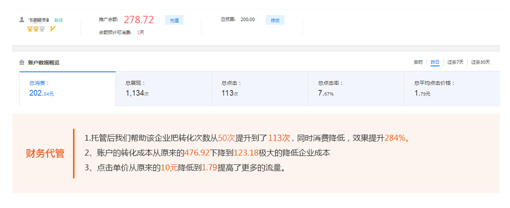 實戰經驗豐富,99%的賬戶問題都知道如何解決專業團隊負責,有專業數據分析團隊、競價優化團隊,全面的解決賬戶問題;對效果負責,以咨詢量作為考核指標,把競價托管前后數據對比,讓企業清楚看到競價托管效果;節省運營成本,托管費用相對自己招聘sem優化專員要節省很多,專業的人做專業的事;