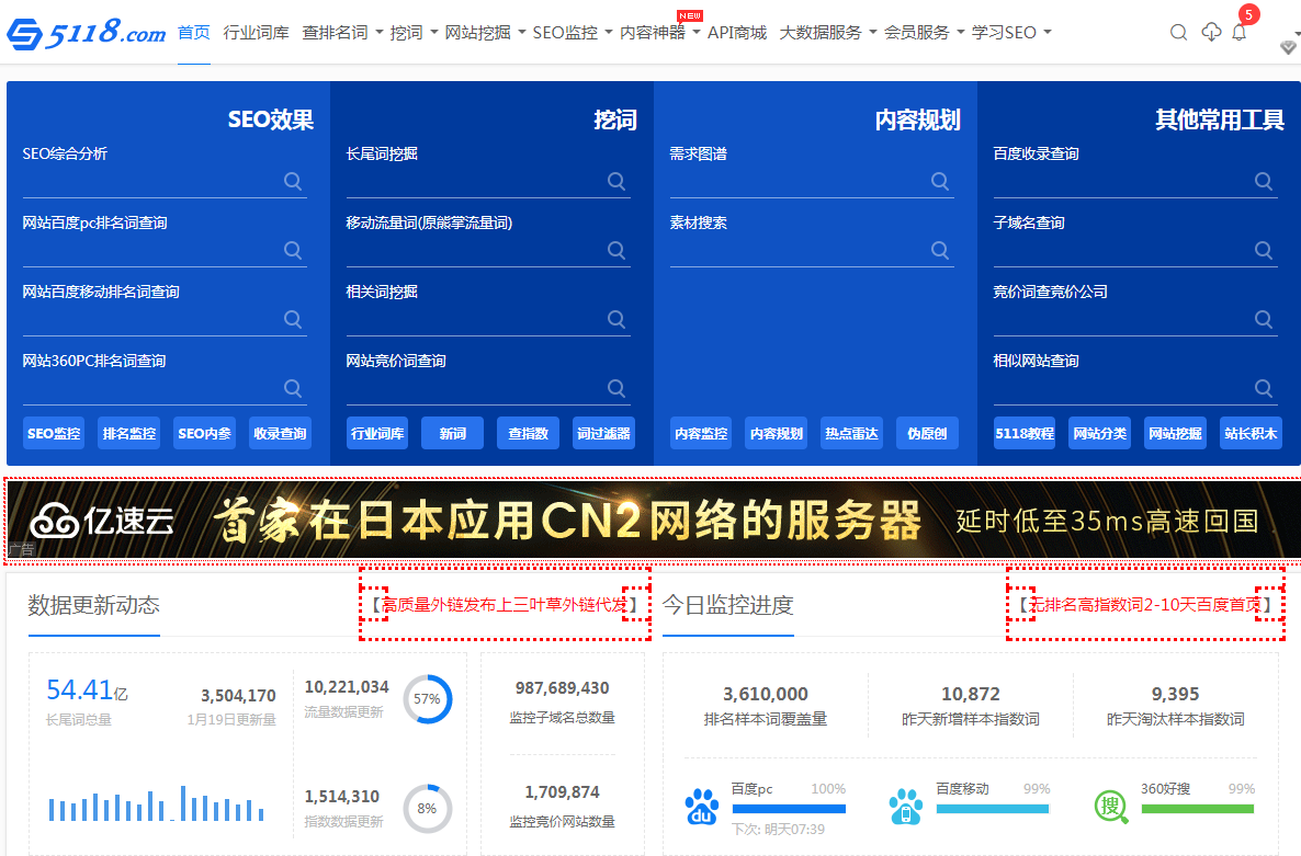 5118是一款SEO關鍵詞工具,專門做營銷型網站等各類SEO網站關鍵詞分析的,分為長尾詞庫、競價詞庫、熱門關鍵詞庫、行業關鍵詞庫以及網站詞庫等,還能預測熱門關鍵詞以及網站綜合分析等