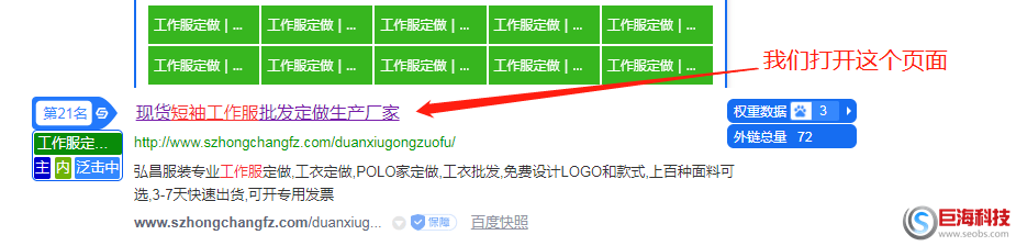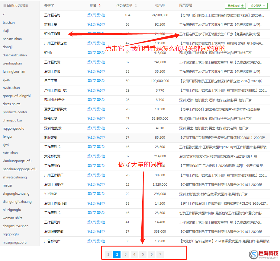 打開愛站輸入該網(wǎng)站域名,詞庫翻到第二頁,頑石SEO以短袖工作服為例。看看該站點(diǎn)都在哪些網(wǎng)頁上布局了這個(gè)關(guān)鍵詞。